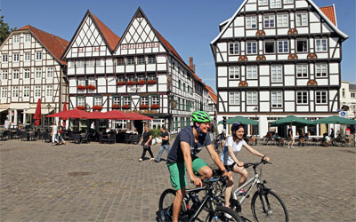 Van Osnabrück naar Bremen (en terug) - 317 km Op deze lus van 317 km valt veel te ontdekken. Hij verbindt twee cultuurhistorisch gezien belangrijke Hanzesteden via twee parallel lopende trajecten en ontleent zijn naam aan de talrijke historisch belangrijke of architectonisch interesssante bruggen langs het traject. Maar ook schilderachtige dorpen, drie natuurparken, imposante veenlandschappen, bossen en heuvelachtige uitlopers. Fietsgids: Brückenradweg