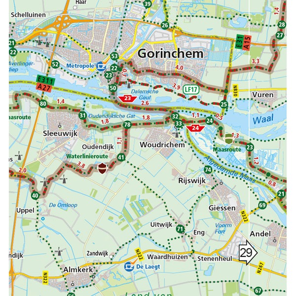 This is a very useful cycle atlas (only available in Dutch) for a (multi-day) cycle trip in the Netherlands. The complete LF route network and all cycle junctions are mapped out on a set of waterproof unbound maps (scale 1:100,000). Cycle-friendly accommodation providers are also included on the maps.