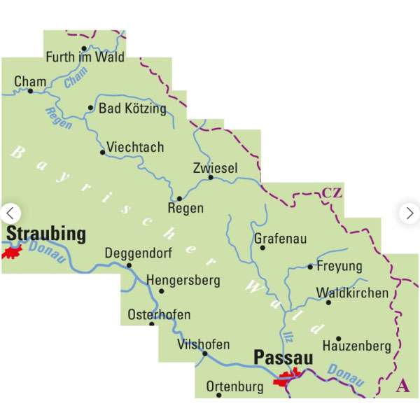 Radeln im Bayerischen Wald. Die spezielle E-Bike-Karte umfasst das Gebiet von Straubing über Deggendorf, Vilshofen bis Passau und Cham, Bad Kötzing, Zwiesel, Grafenau, Freyung, Waldkirchen mit Donau, Ilz und Regen.