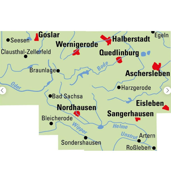 Radeln im Harz. Die Fahrradkarte umfasst das Gebiet Goslar, Clausthal-Zellerfeld, Braunlage, Wernigerode, Brocken, Halberstadt, Quedlinburg, Aschersleben, Harzgerode, Eisleben, Sangerhausen, Nordhausen, Bad Sachsa, Bleicherode, Sondershausen, Roßleben mit Oder, Bode, Wipper, Helmb und Unstrut.